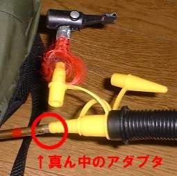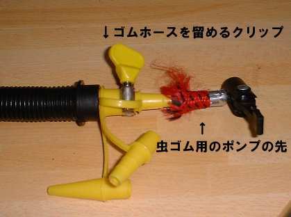 Cの作業で少々空気が抜けるので 不要になった虫ゴム用のポンプの先 を切り取った物を適当なアダプタにつ けて空気を足す。 この時けっこう空気圧がかかるので アダプターとホースの継ぎ目に水道菅とホースをつなぐクリップ等を付けておくと安心。 |
